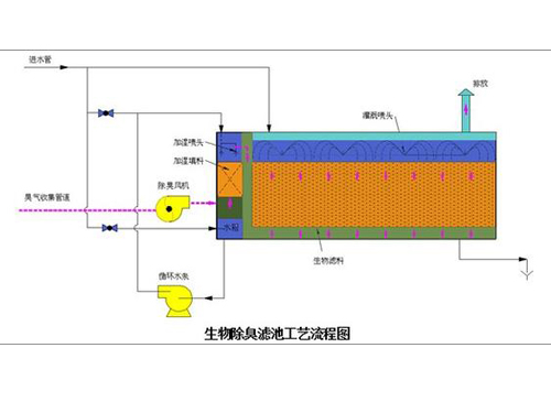 惡臭氣體經過管道收集后進入預處理裝置,經水洗加濕使廢氣的濕度達到90%以上,濕氣體再進入生物過濾除臭裝置,氣流與循環液在穿過生物填料層的過程中完成生物的氣液擴散、液固擴散、生物氧化三個過程,生物填料表面生物膜中的微生物以惡臭氣體物質為營養,惡臭物及VOCs被微生物氧化分解,在轉化過程中產生能量,為微生物的生長與繁殖提供能源,使惡臭氣體物質的轉化持續進行,經凈化后的氣體由引風機引出排放。